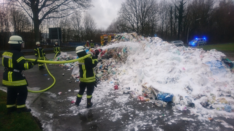 Die Besatzung eines GWA-Müllfahrzeugs hatte nach dem Leeren von Recycling-Containern Rauch aus dem Laderaum aufsteigen gesehen. Geistesgegenwärtig fuhr der Fahrer eine asphaltierte Fläche auf der Capeller Straße, Nähe Icopal, an und entlud das Fahrzeug. Obwohl die Feuerwehr zunächst keine Feststellung machte, konnte das Glutnest durchaus unter dem mehrere Kubikmeter großen Müllhaufen weiter glimmen. Um nicht zur besten Festzeit einen Vollbrand löschen zu müssen, wurde zunächst ein Schaumteppich gelegt und von der Firma GWA RE in Lünen Container angefordert. Die nahe gelegene Firma RCS Rohstoffverwertung GmbH lieh den Kollegen aus Lünen einen geeigneten Bagger aus. So konnte der Müll auseinander gezogen werden und - mit Netzmittel versehen - verladen werden. Ein Durchzünden mit dem nachfolgenden größeren Brand konnte damit verhindert werden. Für die Zeit der Arbeiten war die Capeller Straße zwischen dem Kreisverkehr und der Einmündung Pagensstraße in beiden Richtungen gesperrt. Der Einsatz konnte gegen 15:50 Uhr beendet werden und die Einsatz Kräfte waren pünktlich zur Bescherung wieder bei ihren Familien.