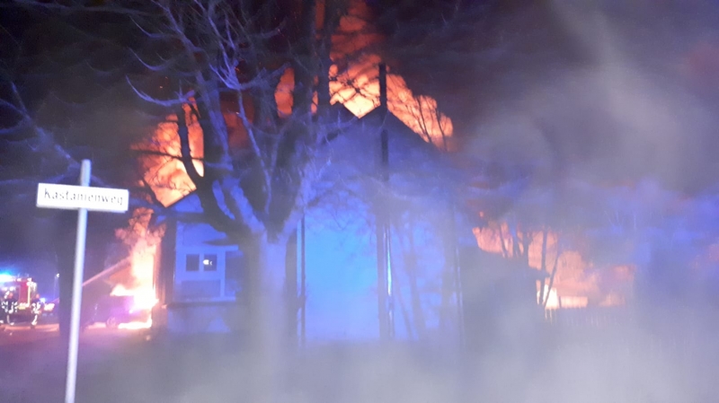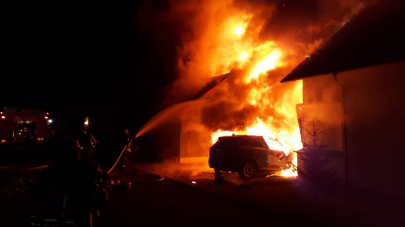Danach wurden die Freiwilligen Kräfte zu einem Großbrand in den Ortsteil Rißegg alarmiert. Dort brannte ein Carport sowie drei darin befindliche PKWs. Das Feuer war bereits auf die links und rechts angebauten Wohnhäuser übergegangen. Bei dem Brand wurden keine Personen verletzt. Es entstand hoher Sachschaden, beide Wohnhäuser sind derzeit nicht bewohnbar.