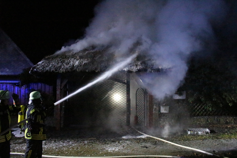 „Schuppenbrand in Bavendorf“ lautete das Einsatzstichwort. Doch stellte sich der Einsatz als Brand eines reetgedeckten Eingangstors heraus. Beim Eintreffen der Einsatzkräfte war das Feuer bereits in die tieferen Schichten des Reets eingedrungen, was das Löschen des Brandes erschwerte.