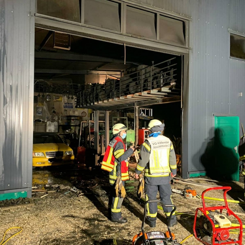 Auf Anfahrt zur Einsatzstelle konnten wir durch die starke Rauchentwicklung das Feuer bestätigen. An der Einsatzstelle angekommen, wurden sofort Löschmaßnahmen durch mehrere eingesetzte Trupps unter schwerem Atemschutz eingeleitet. Es brannten mehrere Fahrzeuge im Inneren der Halle. Der Brand konnte durch die massiven Löschmaßnahmen relativ schnell unter Kontrolle gebracht werden.