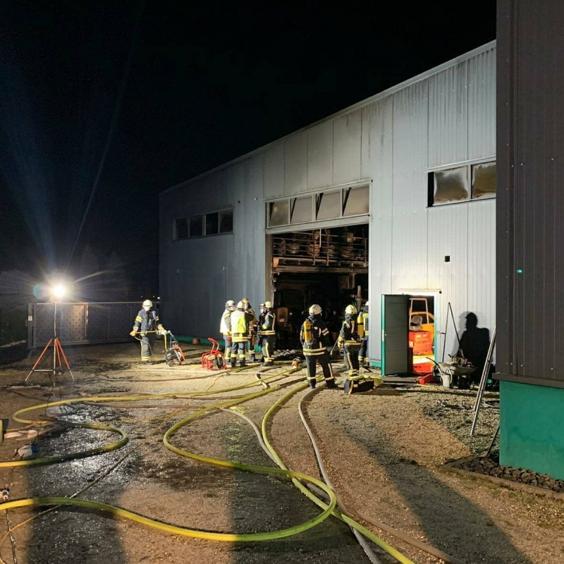 Aus noch ungeklärter Ursache entwickelte sich ein Brand einer Lagerhalle. Nach derzeitigem Ermittlungsstand ist eine Brandstiftung eher unwahrscheinlich. Vermutet wird ein technischer Defekt an einem der sechs Fahrzeuge (u.a. Traktoren), die in der Lagerhalle standen. Die Lagerhalle dürfte in etwa 20 x 20 m groß gewesen sein. Die Angaben sind unter Vorbehalt zu sehen, da der Eigentümer "unter Schock" steht und noch keine konkreten und verlässlichen Angaben zu den Fahrzeugen, der Lagerhalle etc. machen konnte. So ist die Schadenshöhe von 150000 EUR auch nur als sehr grobe Schätzung anzusehen.