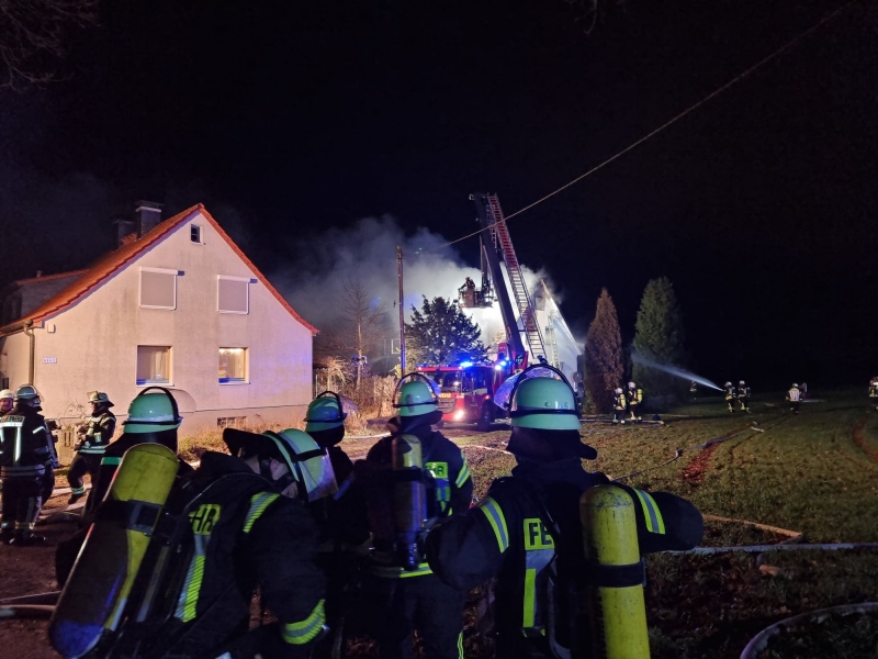 Bei Eintreffen der ersten Einsatzkräfte stand das Obergeschoss wie auch der Dachstuhl eines Wohnhauses in Vollbrand. Anwohner waren zu diesem Zeitpunkt keine mehr im Gebäude.