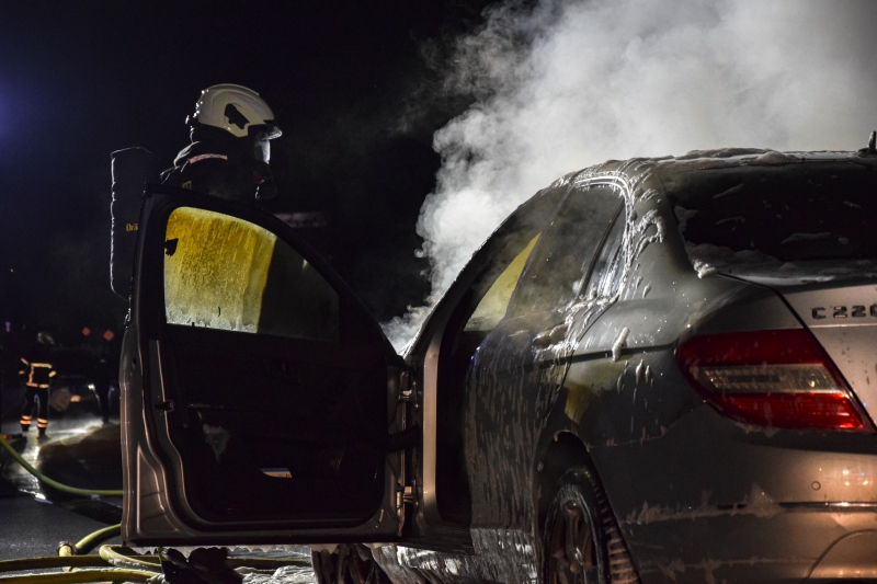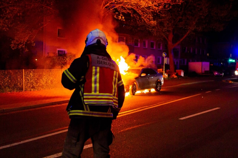Mit dem Alarmstichwort PKW Brand wurde die Berufsfeuerwehr Iserlohn um 22:29 Uhr in die Westfalenstraße gerufen. Dort war auf Höhe der Hausnummer 99 ein Mercedes in Brand geraten. Bei Eintreffen der Feuerwehr stand der Wagen schon voll in Flammen, der Fahrer konnte sich aber noch rechtzeitig aus dem PKW befreien. Mit einem C Rohr wurden zunächst die Flammen gelöscht und anschließend wurde der Wagen mit Schaum geflutet um restliche Glutnester zu ersticken. Da mit der Wärmebildkamera immer wieder hohe Temperaturen festgestellt wurden, wurde noch mehrmals mit Wasser nachgespült, bis die Einsatzstelle der Polizei übergeben werden konnte. Die Westfalenstraße war auf Höhe der Einsatzstelle für die Dauer des Einsatzes voll gesperrt. Nach etwa 45 min konnte die Feuerwehr wieder einrücken.