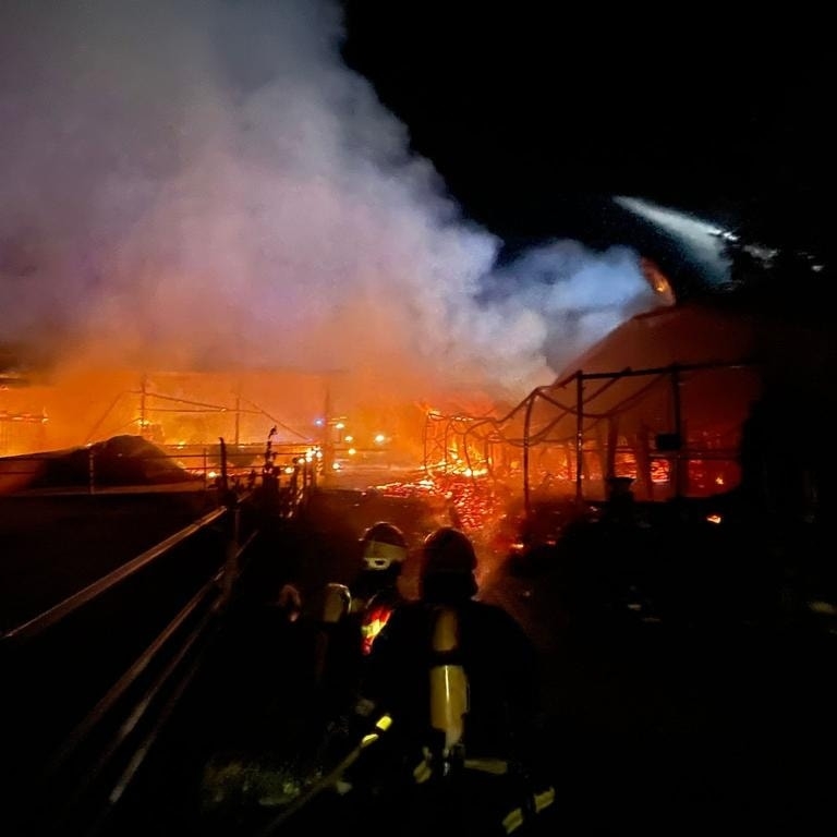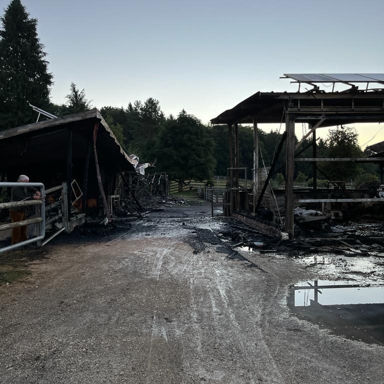 Am späten Sonntagabend sind auf einem Hofgut bei Burladingen zwei Stallanlagen abgebrannt, Tiere sind nicht zu Schaden gekommen. Um 22.50 Uhr wurden die Rettungskräfte über die brennenden Pferdestallanlagen auf dem Hofgut "Küche" nahe Burladingen informiert. Beim Eintreffen der ersten Einsatzkräfte standen bereits zwei Stall-Gebäude lichterloh in Flammen. Die Feuerwehr, die mit 15 Fahrzeugen und 60 Einsatzkräften vor Ort war, konnte ein Übergreifen auf ein nahegelegenes Wohnhaus verhindern. Die beiden Stallanlagen, in denen sich teilweise auch Arbeitsgeräte und ein Traktor befunden haben, brannten komplett nieder. Die auf dem Gelände befindlichen Pferde kamen nicht zu Schaden, da sie sich bei Brandausbruch auf einer angrenzenden Koppel und nicht in den betroffenen Ställen befanden. Personen wurden nicht verletzt. Der Rettungsdienst, der mit drei Fahrzeugen und 12 Einsatzkräften vor Ort war, musste nicht tätig werden. Nach ersten Schätzungen entstand ein Sachschaden in Höhe von ca. 300.000 Euro. Die Kriminalpolizei hat vor Ort die Ermittlungen zur Brandursache aufgenommen.