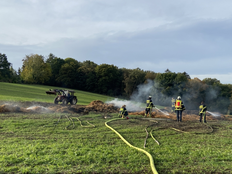 Gegen 8 Uhr meldete ein Anrufer, dass die Strohballen wieder erheblich qualmten. Ein Löschzug fuhr daraufhin wieder die Einsatzstelle an. Bei Eintreffen brannten Teile des Strohs schon wieder. Es herrschte starker Wind aus Südost, der den Brand immer weiter anfachte. Mit der Wärmebildkamera wurde erkannt, dass sich in den Strohhaufen noch weitere Glutnester befanden. Ein Löschangriff mit 2 C- und 1- B Rohr wurde wiederum vorgenommen. Zwei Landwirte unterstützen die Löschmaßnahmen der Feuerwehr und legten die Glutnester im Strom mit ihren Traktoren frei. Einsatzkräfte waren zudem mit Dunkhaken per Hand tätig. Parallel löschte die Feuerwehr den Brand ab. Diese Maßnahme zeigte sich effektiv und um 11:20 Uhr konnte schließlich Feuer aus vom Einsatzleiter gemeldet werden. Die Löschwasserversorgung war durch einen Hydranten sichergestellt. Somit war die Feuerwehr insgesamt 8 Stunden an dieser Einsatzstelle tätig.