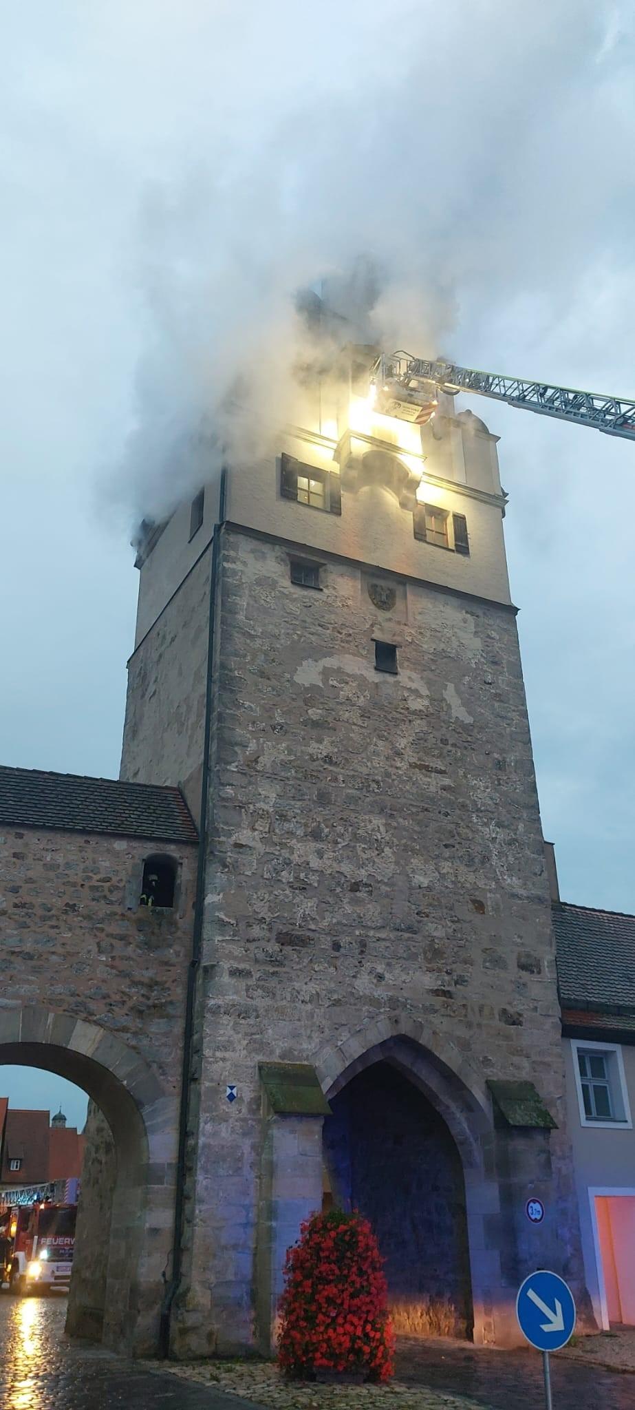 Am Mittwochmorgen (09.08.2023) geriet der Turm des Nördlinger Tors in Dinkelsbühl (Lkrs. Ansbach) in Brand. Die Höhe des Schadens am denkmalgeschützten Gebäude ist noch nicht abschätzbar.