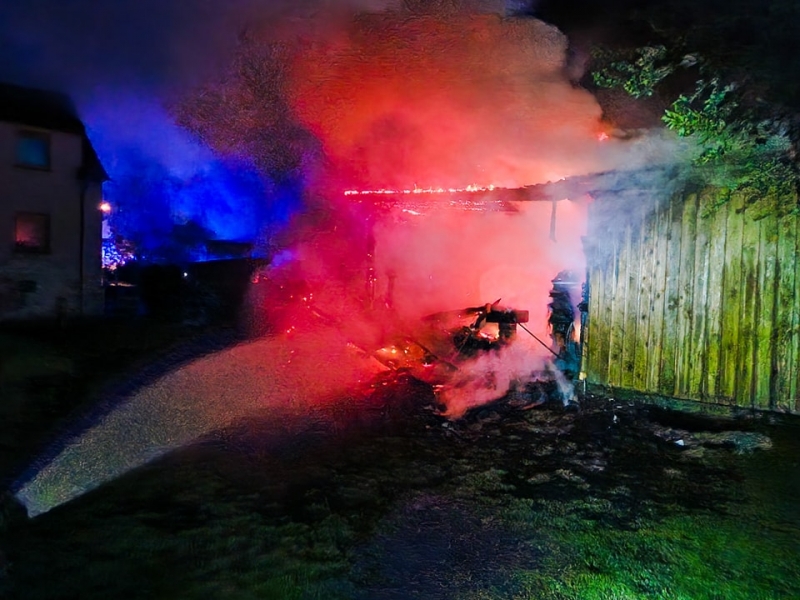 "Vermeintlicher Garagenbrand" lautete das Einsatzstichwort, zu dem wir heute Nacht zusammen mit der Feuerwehr Hattenhof alarmiert wurden. Da bereits auf der Anfahrt ein großer Feuerschein ersichtlich war, bestätigte sich die Vermutung und weitere Kräfte aus Dorfborn und Rommerz wurden umgehend nachalarmiert. Die Erkundung ergab, dass hinter einem Wohnhaus ein Carport, ein untergestelltes Fahrzeug sowie ein angrenzender Garagenkomplex brannten. Durch Vornahme von vier C-Rohren unter Atemschutz konnte nicht nur erfolgreich eine Riegelstellung zum Schutz des Hauses aufgebaut werden, sondern auch der Brand zügig gelöscht werden. Da sich noch einige Glutnester in der Decke der Garage befanden, musste Teile davon entfernt werden, um das Feuer vollständig löschen zu können. Nach zweieinhalb Stunden konnte der Einsatz schließlich beendet werden.