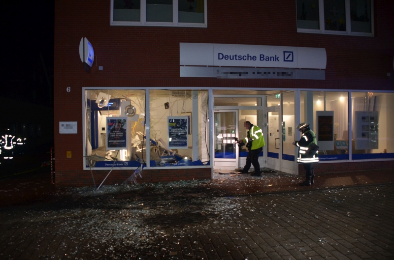 In der Nacht von Freitag auf Samstag gegen kurz vor 03:00 h haben bisher unbekannte Täter in Harsefeld in der Marktstraße in der dortigen Filiale der Deutschen Bank einen Geldautomaten gesprengt. Durch die Wucht der Explosion waren die Scheiben der Räumlichkeiten zu Bruch gegangen und die Scherben sowie Teile des Bargeldes aus den Automaten auf die Straße geschleudert worden. Durch die Feuerwehr konnte ein Brand vor dem Gebäude schnell gelöscht werden. Eine sofort eingeleitete Fahndung blieb zunächst erfolglos. (wir berichteten)