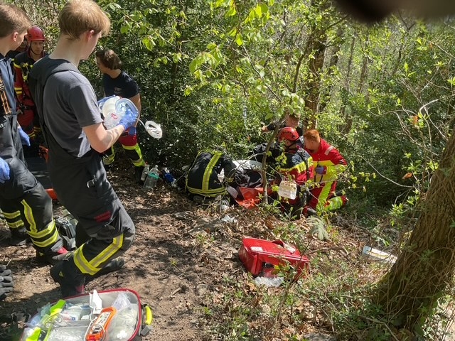Gegen 14:50 Uhr ging bei der Leitstelle der Feuerwehr Dortmund ein Notruf aus einem Waldstück in Syburg ein. Ein Mountainbikefahrer war auf einem Trail oberhalb des Klusenberg gestürzt und verletzte sich schwer. Die beiden mit ihm unterwegs befindlichen Kollegen leisteten Erste Hilfe und setzten einen Notruf ab. Aufgrund des unwegsamen Geländes, wurde durch die Einsatzleitstelle nicht nur der Rettungsdienst, sondern auch ein Fahrzeug der Feuerwache Hörde und die Freiwillige Feuerwehr Syburg alarmiert. Nach der ersten Erkundung wurden die Höhenretter der Feuerwehr und ein Führungsdienst nachalarmiert. Die ersten Einheiten übernahmen unmittelbar nach dem sie bei dem Verunfallten angekommen waren, die medizinische Versorgung. Da ein Abtransport aus dem Steilhang für den Patienten sehr belastend und schmerzhaft geworden wäre, entschied sich der Einsatzleiter in Absprache mit dem Einheitsführer der Höhenrettung, für eine Rettung mit der Winde des Rettungshubschraubers Christoph Dortmund. Um den Patienten für den Transport vorzubereiten und eine erweiterte medizinischen Versorgung durchzuführen, wurde der Notarzt des Hubschraubers mit der Rettungswinde unmittelbar an der Einsatzstelle abgelassen. Nachdem der Patient durch den Notarzt weiter versorgt war, wurde er in einen speziellen Transportsack zur Rettung mit der Winde gelagert. Anschließend erfolgte die Rettung aus dem Steilgelände an der Winde unter Begleitung des Notarztes und der Patient wurde mit dem Rettungshubschrauber einer Dortmunder Klinik zugeführt.