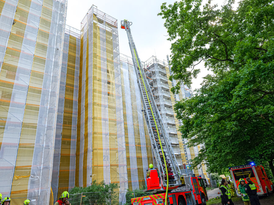 Gegen 16:00 Uhr meldeten mehrere Anrufende der Regionsleitstelle Explosionen und eine starke Rauchentwicklung auf dem Dach eines neungeschossigen Wohngebäudes im Canarisweg. Aufgrund dieser Meldung wurden umgehend zwei Löschzüge und eine Freiwillige Feuerwehr sowie der Rettungsdienst an die Einsatzstelle alarmiert. Bereits auf Anfahrt war von weitem eine große, schwarze Rauchsäule zu erkennen, woraufhin die Einsatzleitung die Alarmstufe und damit die Anzahl an Fahrzeugen und Personal noch einmal erhöhte. Zudem wurden mehrere Führungskräfte zur eventuellen Bewältigung eines Massenanfalls von Verletzten angefordert.