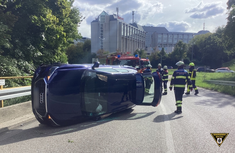 Aus unbekannter Ursache überschlug sich ein dunkelblauer Audi stadtauswärts. Die automatischen Notrufsysteme des Fahrzeuges und eines Smartphones verständigten daraufhin die Feuerwehr über diesen Vorfall. Mehrere Einheiten des Rettungsdienstes und der Feuerwehr wurden zur Einsatzstelle alarmiert. Entgegen ersten Informationen waren ein Kind und eine erwachsene Person nicht eingeklemmt; sie hatten das Auto noch vor Eintreffen der ersten Kräfte bereits leicht verletzt verlassen können.