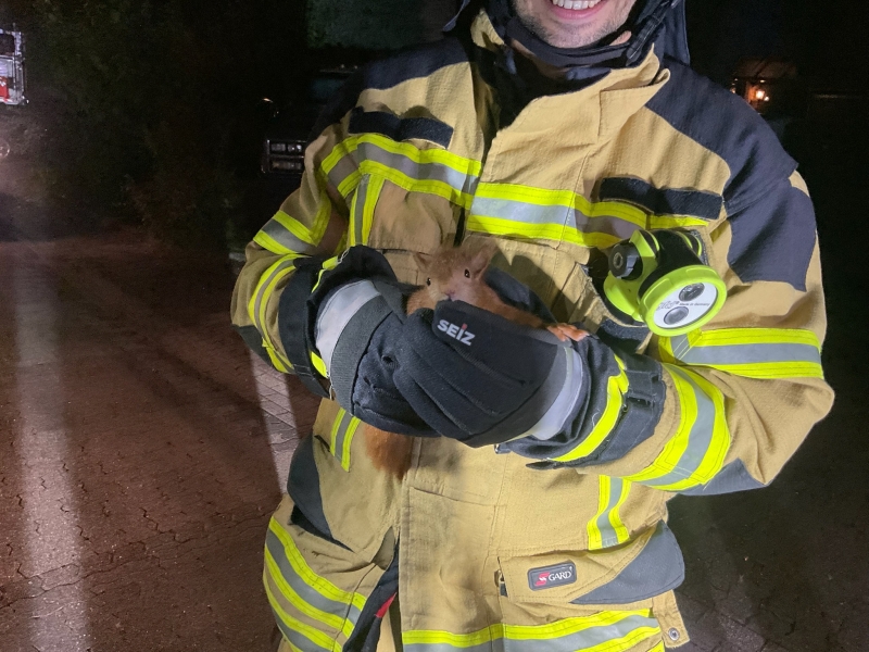 Am Abend kletterte ein Eichhörnchen am Mühlenturm eine Hausfassade hinauf und gelangte von dort aus in einen Dachvorsprung. Leider war es dort so eng, dass das Eichhörnchen steckenblieb. Ein besorgter Anwohner, der die verzweifelten Rufe des Eichhörnchens wahrnahm, alarmierte daraufhin die Feuerwehr. Die Einheit Alpen der Freiwilligen Feuerwehr Alpen wurde mit dem Stichwort "Tier in Not" zur Einsatzstelle alarmiert. Mithilfe der Drehleiter konnten die Einsatzkräfte das Eichhörnchen erreichen und sich ein Bild von der Zwangslage machen. Da es nicht möglich war, das Eichhörnchen aus seiner misslichen Lage zu befreien, mussten die Feuerwehrleute vorsichtig einen Teil der Dachvertäfelung entfernen. Danach gelang es, das Eichhörnchen zu packen und vorsichtig nach unten zu bringen. Es war zwar sichtlich erschöpft, aber sonst unverletzt, sodass es schlussendlich in die Natur entlassen werden konnte.
