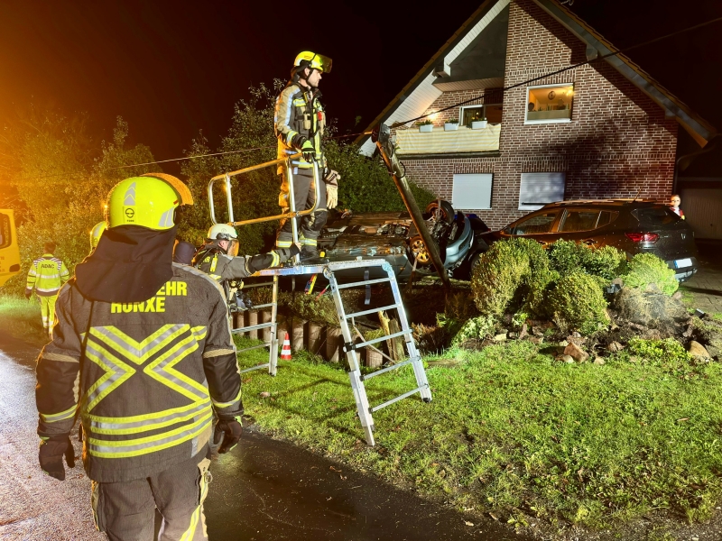 An der Einsatzstelle war ein Pkw von der Fahrbahn abgekommen, hatte sich überschlagen und lag anschließend auf dem Dach im Vorgarten eines Hauses. Bei dem Unfall wurde außerdem ein Telefonmast beschädigt. Der anfängliche Gasgeruch, aufgrund dessen die Feuerwehr nachalarmiert wurde, bestätigte sich nicht. Die Einsatzstelle wurde gegen den fließenden Verkehr abgesichert und der Brandschutz sichergestellt. Der Rettungsdienst hat die vier Insassen des Pkw gesichtet; alle waren unverletzt und konnten die Unfallstelle eigenständig verlassen. Der Telefonmast wurde mit einer Kettensäge abgetrennt und das Kabel durchtrennt, um die Bergung des Unfallfahrzeugs zu ermöglichen. Der Einsatz war nach ca. zwei Stunden beendet.