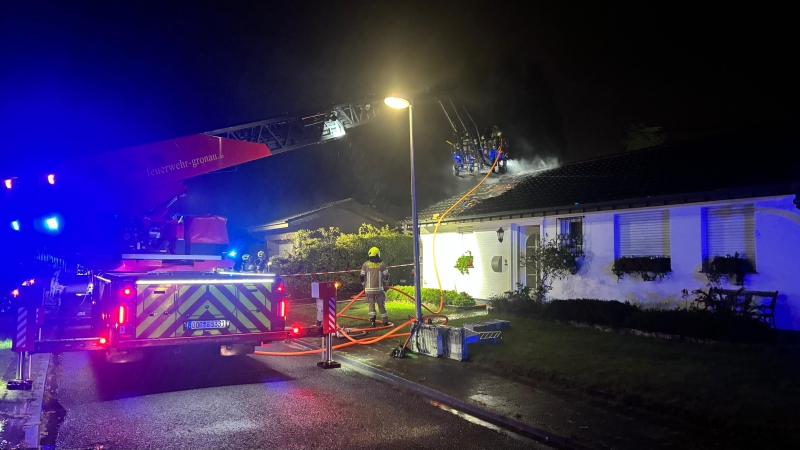 Beim Eintreffen an der Einsatzstelle waren Flammen und Rauch aus dem Dachstuhl erkennbar. Über die Drehleiter wurde unmittelbar die Brandbekämpfung eingeleitet, der Dachraum wurde geöffnet.