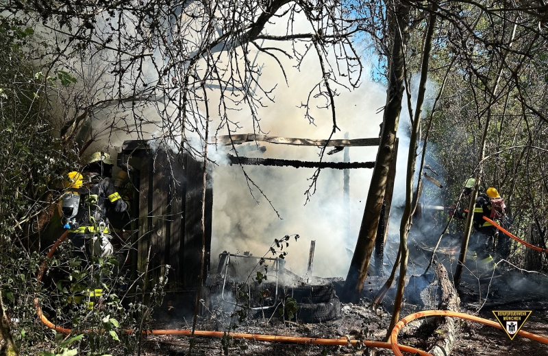In einem eingezäunten Gartengrundstück, umgeben von dichtem Buschwerk, stand ein Anbau einer Gartenhütte in Vollbrand. Das Feuer hatte bereits auf die angrenzende Hütte übergegriffen und drohte, sich über den Giebel auf den gesamten Aufbau auszubreiten.