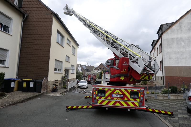 Am Sonntag Nachmittag wurden die Einsatzkräfte von Feuerwehr und Rettungsdienst in den Blausielweg nach Dortmund-Berghofen alarmiert. Dort wurde Rauch aus dem Keller gemeldet, der sich auch schon im Hausflur ausgebreitet hatte. Sofort nach dem Eintreffen machte sich ein Atemschutztrupp der nahegelegenen Feuerwache 4 (Hörde) zur Brandbekämpfung in den Keller auf um die Ursache für den Brandrauch zu suchen. Zeitgleich kontrollierte ein weiterer Trupp das Treppenhaus nach möglichen Personen. Einige Bewohner des Hauses konnten sich ins Freie begeben, während andere in ihren sicheren Wohnungen verblieben, da der Fluchtweg durch das Treppenhaus durch den Rauch nicht ohne Gefahr passierbar war. Von außen wurden sie dann über die Drehleiter an den Fenstern betreut. Verletzt wurde bei diesem Einsatz niemand. Das Feuer im Untergeschoss, verursacht durch Elektrogeräte, konnte schnell gelöscht werden. Der entstandene Rauch im Keller und im Treppenhaus wurden im Anschluss noch mit Hochleistungslüftern entfernt. Nach etwas mehr als einer Stunde waren die Maßnahmen der Feuerwehr beendet und die Bewohner konnten zurück in ihre Wohnungen. Die genaue Entstehungsursache wird nun von der Polizei ermittelt. Ca. 40 Einsatzkräfte der Feuerwache 4 (Hörde), Feuerwache 3 (Neuasseln), dem Löschzug 13 der Freiwilligen Feuerwehr und dem Rettungsdienst waren vor Ort.