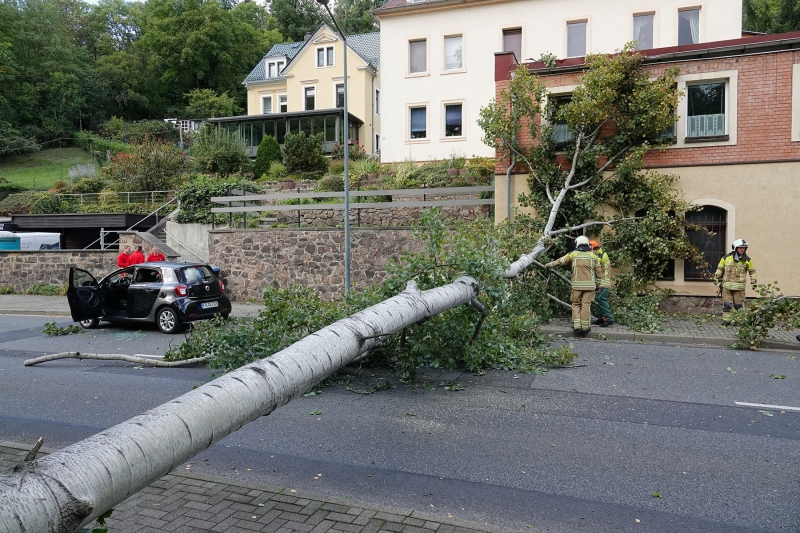 Der Einsatz auf der Tharandter Straße, welcher sich um 14:57 Uhr ereignete wird einer Autofahrerin sicher nicht unvergessen bleiben. Denn sie befuhr die Straße als plötzlich ein Baum auf ihr fahrendes Fahrzeug krachte. Sie wurde dabei leicht verletzt, der mitalarmierte Rettungsdienst versorget die Patientin. Die Feuerwehrleute sicherten den Verkehrsraum als erstes ab und begannen zügig den ca. 20 Meter hohen Baum von der Fahrbahn zu räumen. Auch hier haben wieder die Motorkettensägen eine vorbildliche Arbeit geleistet. Der Baum hatte auch noch eine Hausfassade eines Gebäudes beschädigt. Beim Begutachten des Baumes wurde festgestellt, dass der zweite Stamm des Baumes ebenfalls eine Gefahr darstellt und in das gegenüberliegende Grundstück eines Autohandels stürzen könnte. Die Polizei sperrte den Bereich ab und der Eigentümer entfernte die unmittelbare betroffenen Fahrzeuge. Der Einheitsführer der Feuerwehr entschied sich den zweiten Stamm mittels einer Drehleiter abzutragen. Durch die weiterhin vorherrschenden Böen war beim Absägen ein Ast zu Boden gefallen und hatte ein weit abgestelltes Fahrzeug getroffen. In dem Einsatz waren die Kollegen der Feuer-und Rettungswache Löbtau mit zwölf Einsatzkräften tätig.