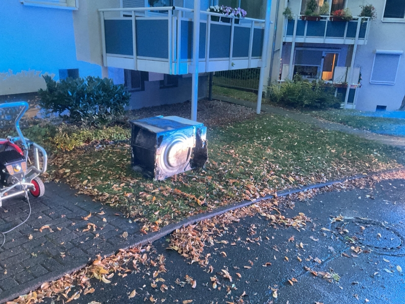 Der brennende Wäschetrockner konnte schließlich aus dem Keller ins Freie gebracht und dort endgültig gelöscht werden. Um das Gebäude rauchfrei zu bekommen, setzte die Feuerwehr mehrere Hochleistungslüfter ein.