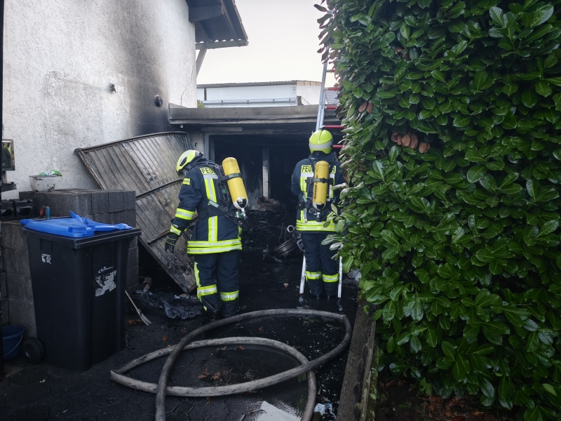Bereits auf der Anfahrt konnte eine schwarze Rauchsäule festgestellt werden. Das ersteintreffende Fahrzeug der Löschgruppe Vlatten fand eine Garage im Vollbrand vor, welche direkt an ein Wohnhaus angebaut war. In der Erstphase des Einsatzes bestand die Gefahr des Übergreifens auf das Wohngebäude. Umgehend wurden zwei C-Rohre unter umluftunabhängigem Atemschutz zur Brandbekämpfung sowie zur Riegelstellung zum Wohnhaus vorgenommen.