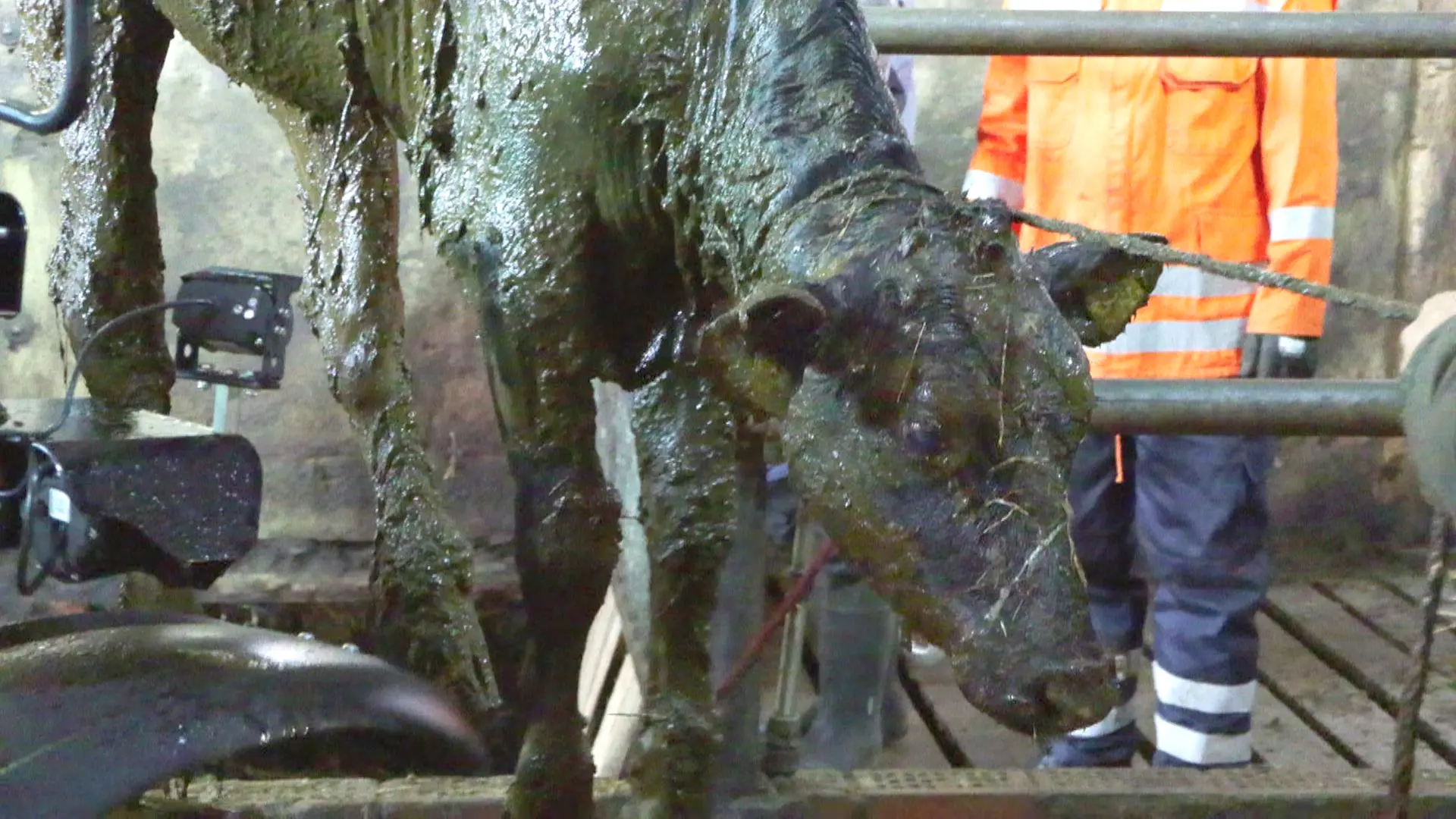 Mit Unterstützung von Mitarbeitern des Hofes und einem hinzugezogenen Tierarzt konnten die Tiere schließlich nach rund zweieinhalb Stunden aus der misslichen Lage befreit werden. Hierzu wurden Bandschlingen unter den Tieren durchgezogen und angebracht, sodass diese mit einem Teleskoplader vorsichtig aus der Grube gehoben werden konnten. Im Anschluss wurden die Jungrinder mit Wasser abgespritzt und durch den Tierarzt untersucht. Alle sechs Tiere überstanden den Sturz und die Rettung unbeschadet und waren wenige Minuten später schon wieder am toben.