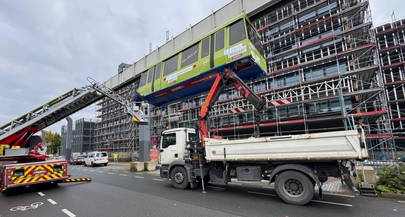 In enger Abstimmung mit dem Betreiber konnte der Autokran im weiteren Verlauf zurückgenommen werden. Die H-Bahn ist derzeit nicht fahrbereit. Der Grundschutz der Feuerwache 8 verbleibt aktuell noch an der Einsatzstelle, um mögliche Restarbeiten abzusichern.
