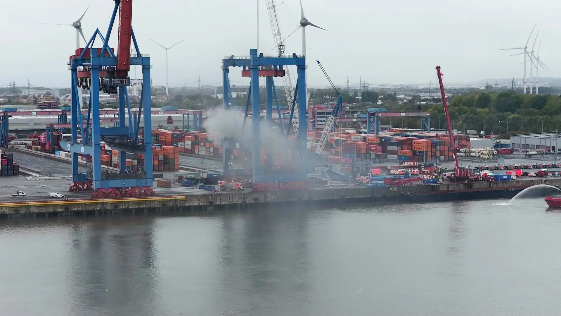 Die Einsatzkräfte der Feuerwehr retteten beim Eintreffen an der Einsatzstelle mehrere Personen aus dem Gefahrenbereich und übergaben sie zur Sichtung und medizinischen Versorgung an den Rettungsdienst. Das mitalarmierte Löschboot "Branddirektor Westphal" konnte unverzüglich die Brandbekämpfung mit einem Wasserwerfer aufnehmen. Da durch die Hitzebeaufschlagung der Stahlkonstruktion eine Instabilität der Containerbrücke nicht ausgeschlossen werden konnte, wurden die Brandbekämpfung und Kühlung zunächst nur von außen durchgeführt. Hinzugezogene Statiker und ein Sachverständiger gaben jedoch kurze Zeit später Entwarnung und bestätigten die Standsicherheit der Containerbrücke. Der Brandherd konnte schließlich mit einem Teleskopmastfahrzeug (TMF70) durch Einsatzkräfte unter Atemschutz mit Wärmebildkameras abschließend kontrolliert werden.