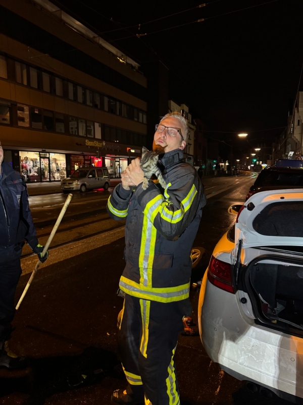 Am gestrigen Abend gegen 21:15 erhielt die Leitstelle der Feuerwehr Bochum einen Anruf, dass sich vermutlich eine Katze unter der Stoßstange eines PKW befindet. Daraufhin wurde das zuständige Hilfeleistungslöschfahrzeug der FRW I zur Bahnhofstr in Bochum-Wattenscheid entsandt. Beim Eintreffen der Kollegen waren leise Miau-Laute aus dem Bereich des hinteren Radkastens zu hören. Der Fahrer gab an gerade aus Hannover gekommen zu sein und als er das Fahrzeug parkte, habe er die Laute festgestellt. Durch die Kollegen wurde das Fahrzeug gegen Wegrollen gesichert, danach wurde das Fahrzeug leicht angehoben und das Hinterrad entfernt. Um einen Zugang zur Katze zu bekommen, wurde ebenfalls die Radkastenverkleidung abgenommen. Nach gutem Zureden kam ein kleines Kätzchen aus ihrem Versteck heraus und konnte durch beherztes Zugreifen eines Kollegen gesichert werden. Das Kätzchen hat glücklicherweise einen Chip und wird vom Fahrer des Fahrzeuges nun wieder nach Hannover gebracht, um es seinen Besitzern zu übergeben. Der Feuerwehr Einsatz dauert rund 70 Minuten.