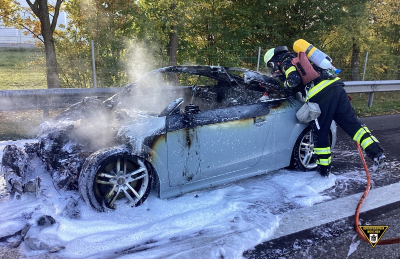 Der Audi TT, der in Fahrtrichtung München unterwegs war, fing kurz nach dem Autobahnkreuz München-West aus noch unbekannter Ursache Feuer. Der Fahrer konnte das Fahrzeug auf dem Standstreifen anhalten, sich hinter der Leitplanke in Sicherheit bringen und die Feuerwehr verständigen. Die anrückenden Einsatzkräfte stellten bereits auf der Anfahrt eine starke Rauchentwicklung fest. Beim Eintreffen an der Einsatzstelle hatte die Polizei den Verkehr schon zum Stehen gebracht und der Pkw stand in Vollbrand. Drei Einsatzkräfte unter Atemschutz gingen unmittelbar zur Brandbekämpfung mit dem Schnellangriffsschlauch eines Hilfeleistungslöschfahrzeuges vor. Diese Vorrichtung ist direkt mit dem Wassertank des Fahrzeuges verbunden und für Einsätze dieser Art bestens geeignet. Im weiteren Verlauf wurde auch Löschschaum eingesetzt, der mit seiner erstickenden Wirkung auch letzte verborgene Glutnester ablöschen kann.