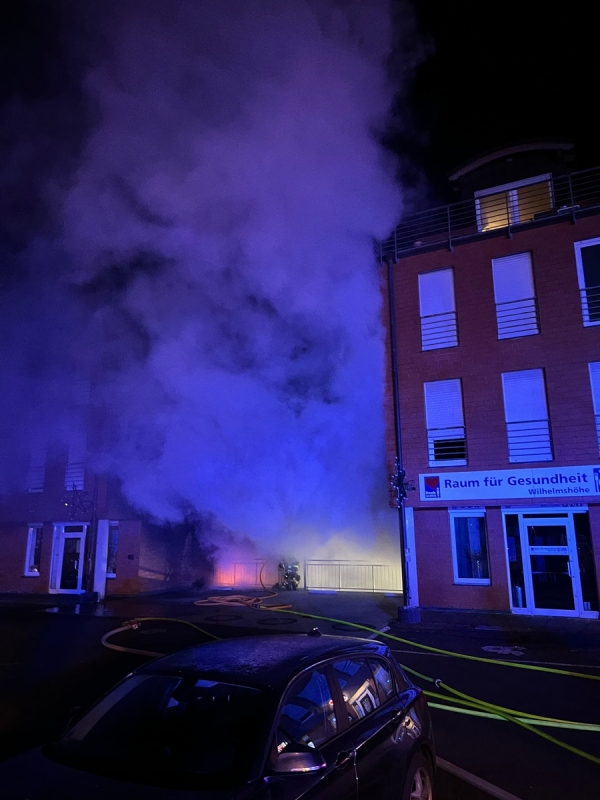 Die Rückmeldung der ersten Feuerwehrkräfte bestätigte den Brand eines überdachten Mülllagers, bestehend aus mehreren 1100 Liter Containern zwischen zwei Mehrfamilienhäusern mit Ladenzeile mit starker Flammenbildung und Rauchentwicklung. Das Feuer drohte auf beide Wohnhäuser überzugreifen.