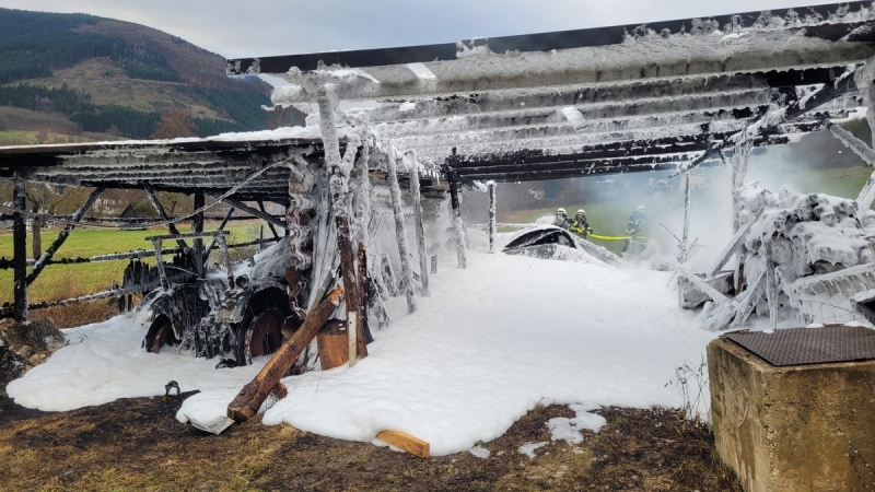 Die Feuerwehr Lennestadt wurde heute gegen 11:30 Uhr zu einem Feuer 3 - Scheunenbrand nach Lennestadt-Saalhausen alarmiert. Beim Eintreffen der ersten Einsatzkräfte stand die Scheune bereits in Vollbrand. Umgehend wurde ein Löschangriff eingeleitet, durch den das Feuer schnell unter Kontrolle gebracht werden konnte. Aus dem Gebäude konnte zudem eine Gasflasche in Sicherheit gebracht und gekühlt werden. Trotz der schnellen Maßnahmen brannte die Scheune während der Löscharbeiten nahezu vollständig bis auf das Grundgestell nieder. In dem Gebäude befanden sich unter anderem ein Traktor sowie Stroh, welche ebenfalls vom Feuer erfasst wurden. Im weiteren Einsatzverlauf wurde die Brandfläche mit einem Schaumangriff benetzt, um ein Wiederaufflammen zu verhindern. Zusätzlich wurde ein Bagger zur Einsatzstelle geordert, mit dem das Brandgut auseinandergezogen wurde, um verbliebene Glutnester gezielt ablöschen zu können.