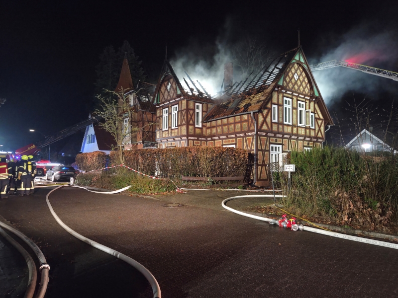 Beim Eintreffen der Feuerwehr stand ein Großteil des Gebäudes bereits in Vollbrand. Insbesondere aus dem Dachstuhl schlugen offene Flammen, eine starke Rauchentwicklung war weithin sichtbar. Aufgrund der Lage und der Brandausdehnung wurde das Alarmstichwort frühzeitig erhöht und zahlreiche weitere Kräfte nachalarmiert.