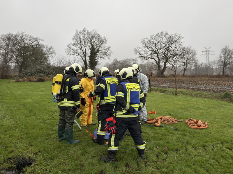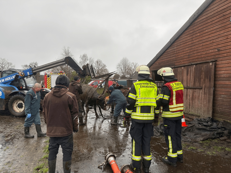 Über mehrere Stunden hat eine Großtierrettung am Silvestervormittag die Feuerwehren Haxtum und Sandhorst im Auricher Ortsteil Rahe gefordert. Bei der Regionalleitstelle in Wittmund war gegen 10:20 Uhr der Notruf eines Landwirts eingegangen, der beim Betreten seines Stallgebäudes feststellte, dass zwei Kühe in den darunterliegenden Güllekeller durchgebrochen waren. Die Tiere steckten bis zum Hals in der Jauchemasse und wirkten bereits völlig entkräftet, weshalb eine sofortige Rettung erforderlich wurde. Mit gut 30 Einsatzkräften rückten die beiden Ortswehren daraufhin an die Oldersumer Straße aus.