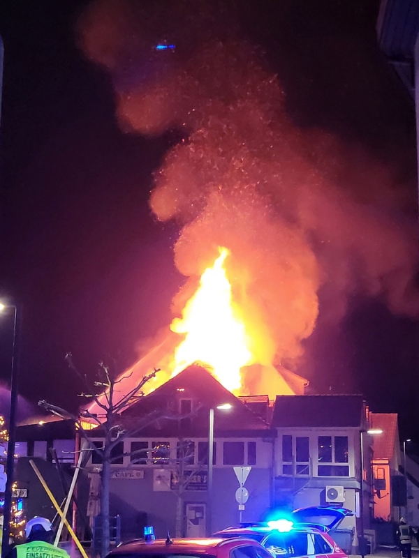 In den frühen Morgenstunden vom 01.01.2026 wurde die Feuerwehr Mengen gegen 6.35 Uhr zu einem massiven Dachstuhlbrand am Rande der Mengener Altstadt alarmiert. Beim Eintreffen der Feuerwehr stand der Dachstuhl eines größeren Wohn- und Gaststättengebäudes bereits in Vollbrand, weshalb zügig weitere Kräfte angefordert wurden. Im Gebäude befindliche Gasflaschen kamen zur Explosion und brachten weitere Gefährdungen für die Einsatzkräfte. Alle Abteilungen der Feuerwehr Mengen, ein zweiter Löschzug aus Bad Saulgau, Kräfte des Gemeindeverwaltungsverbunds Hohentengen und Scheer sowie der Einsatzleitwagen2 aus Sigmaringen und ein Katastrophenschutz-Löschfahrzeug aus Veringenstadt wurden nachalarmiert. Die Brandausbreitung konnte durch die Einsatzkräfte rasch eingedämmt werden. Derzeit sind insgesamt mehr als 180 Rettungskräfte im Einsatz. Es gibt zum Glück aktuell keine verletzten Personen. Das DRK ist ebenfalls mit mehreren Kräften vor Ort und übernimmt die Betreuung der Anwohner im Rettungszentrum Mengen sowie die Versorgung der Einsatzkräfte vor Ort. Die Löscharbeiten dauern zum aktuellen Zeitpunkt noch an. Zur Brandursache liegen aktuell keine Informationen vor. Es geht keine Gefahr für die Anwohner oder für die Bevölkerung aus. Kommandant Seeger gab an, er sei mit der geleisteten Arbeit der Einsatzkräfte höchst zufrieden. Auch der Kreisbrandmeister Michael Reitter sowie der stellvertretende Bürgermeister Georg Bacher lobten das gute Vorgehen der Einsatzkräfte an diesem Neujahrsmorgen.