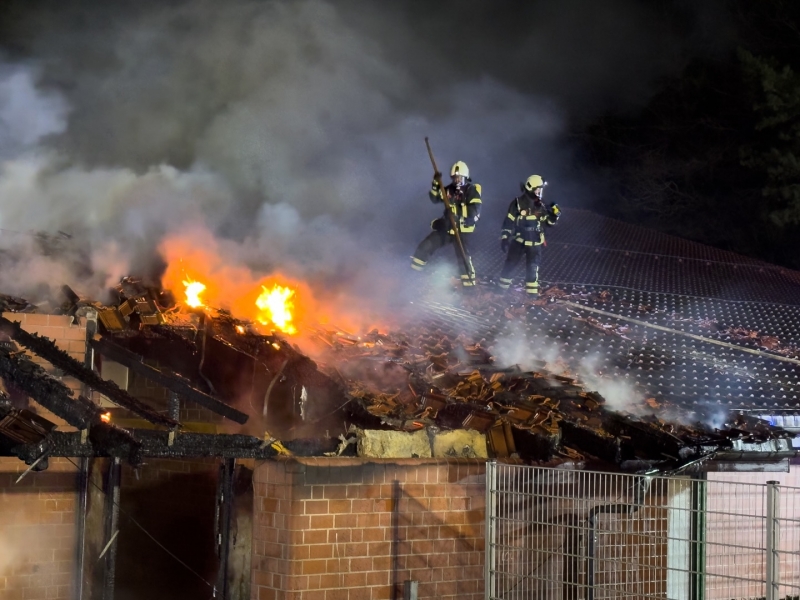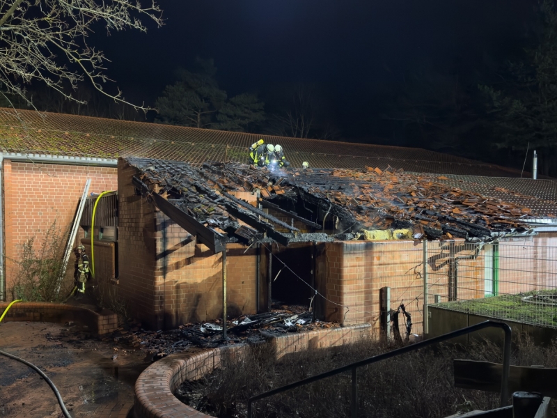 Heute, 2.1.2026, gegen 0:20 Uhr, meldete eine Zeugin Feuerschein im Bereich der Sporthalle neben der Waldschule an der Parkstraße. Als erste Polizeikräfte wenige Minuten später vor Ort eintrafen, befand sich der Eingangsbereich der Sporthalle bereits im Vollbrand. Durch die Feuerwehr konnte ein Übergreifen der Flammen auf die eigentliche Sporthalle verhindert werden. Sie ist aber durch Rauch und Löschwasser in Mitleidenschaft gezogen worden und zunächst nicht nutzbar. Der Dachstuhl des überdachten Eingangsbereichs brannte komplett aus. Der Sachschaden liegt nach ersten Schätzungen der Polizei im mittleren sechsstelligen Bereich.