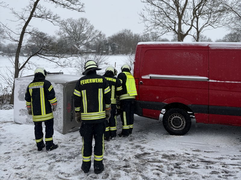 Nachdem die Einsatzkräfte zunächst für eine Absicherung der Unfallstelle gesorgt hatten, richteten sie den auf der Seite liegenden Anhänger kurzerhand wieder auf, woraufhin dieser von der Fahrbahn geschoben werden konnte. Das zweite Fahrzeug, welches im Zuge des Ausweichmanövers von der Straße abgekommen und auf den angrenzenden Bahnschienen zum Stillstand gekommen war, wurde im Anschluss aus dem Gleisbett bewegt. Neben den rund 15 Feuerwehrleuten sind auch der Rettungsdienst und die Polizei vor Ort gewesen. Die Emder Straße, auf der sich durch die Vollsperrung ein entsprechender Rückstau in beide Fahrtrichtungen gebildet hatte, konnte gegen 12:45 Uhr wieder freigegeben werden.