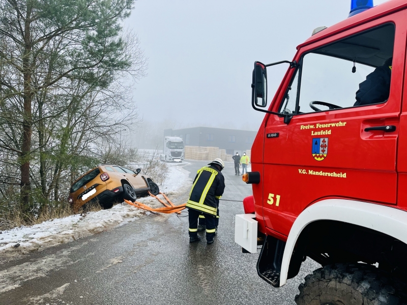 Ein PKW-Fahrer aus der VG Daun geriet in einer Rechtskurve trotz geringer Geschwindigkeit aufgrund von Straßenglätte ins Rutschen. Das Fahrzeug kam neben der Fahrbahn zum Stehen und drohte, eine etwa sechs Meter tiefe Böschung hinabzustürzen. Der Fahrer blieb glücklicherweise unverletzt und konnte selbstständig das Fahrzeug verlassen.