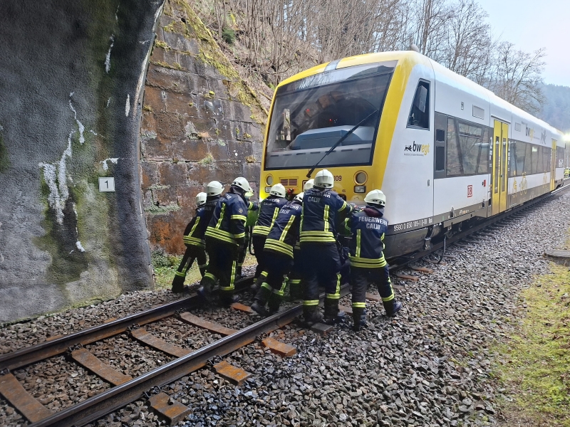 Am frühen Montagmorgen kollidierte ein Regionalzug der Kulturbahn mit 100 Stundenkilometern unweit des Ortsausgangs Calw in Richtung Station Teinach mit einem etwa 6 Kubikmeter großen Felsblock, der nachts auf die Gleise gestürzt war. Während die Wucht der Geschwindigkeit den Felsblock auseinanderbersten und wegschleudern ließ, kam der Zug durch die eingeleitete Vollbremsung des Zugführers nach etwa 600 Metern in einem Tunnel zum Stehen. Die um 6:06 Uhr alarmierte Feuerwehr Calw mit den Abteilungen Calw und Hirsau sowie der Führungsgruppe Stammheim/Holzbronn rückte mit neun Fahrzeugen und 48 Einsatzkräften aus. "Unser Rüstwagen ist mit einem Schienenrollwagen beladen, der es ermöglichte, notwendiges Material zur Einsatzstelle zu befördern", konstatierte Stadtbrandmeister Marcus Frank, Einsatzleiter vor Ort zu den herausfordernden Gegebenheiten des Geländes an der Unfallstelle. Mit Leitern wurden fünf Passagiere und der Zugführer unverletzt aus dem Zug evakuiert und die Fahrgäste nach Vorstellung beim Rettungsdienst durch die Feuerwehr zur Station Teinach gebracht, um ihren Weg fortsetzen zu können. "Da der Zug rund 50 Liter Hydrauliköl durch die Kollision verlor und sich im Tunnel Quellfassungen für Wasser befinden, wurde das Umweltamt hinzugezogen", erläuterte der stellvertretende Kreisbrandmeister André Weiss, der ebenfalls zur Einsatzstelle geeilt war. Der Großteil konnte gleichwohl in einer Wanne aufgefangen werden, sodass die Quellfassungen in dem Wasserschutzgebiet nicht beeinträchtigt wurden. Um eine Untersuchung des stark beschädigten Zugs durch Bahnexperten zu ermöglichen, schoben zehn Feuerwehrleute den Wagen mit Muskelkraft vor das Tunnelportal. Gegen 11 Uhr konnte die Feuerwehr zurück in die Wache fahren, während die Bahn das Abschleppen des Zugs organisierte.