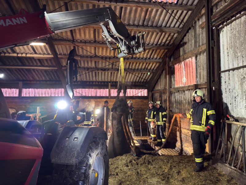 Die Situation vor Ort erwies sich eingangs zeitkritisch, da eines der Tiere bereits zum Großteil in der angestauten Gülle des gut 2,20 Meter tiefen Kellers versunken war. Den anwesenden Landwirten und Feuerwehrleuten gelang es, den Kopf der Kuh mit einer Leine zu versehen und sie so über der Oberfläche zu halten. Das zweite Tier war offenbar hinterhergestürzt und lag zum Großteil auf dem schon weithin versunkenen Rind, sodass die Einsatzkräfte gut an den Körper herangelangen und entsprechende Haltegurte befestigen konnten. Parallel nahm ein Pumpfahrzeug einiges an Inhalt aus dem Güllekeller auf, sodass der Pegelstand abgesenkt worden ist. Mit einem auf dem Hof vorhandenen Teleskopfahrzeug wurde das erste der beiden Lebewesen rund 30 Minuten nach Eintreffen aus der Grube gehoben.