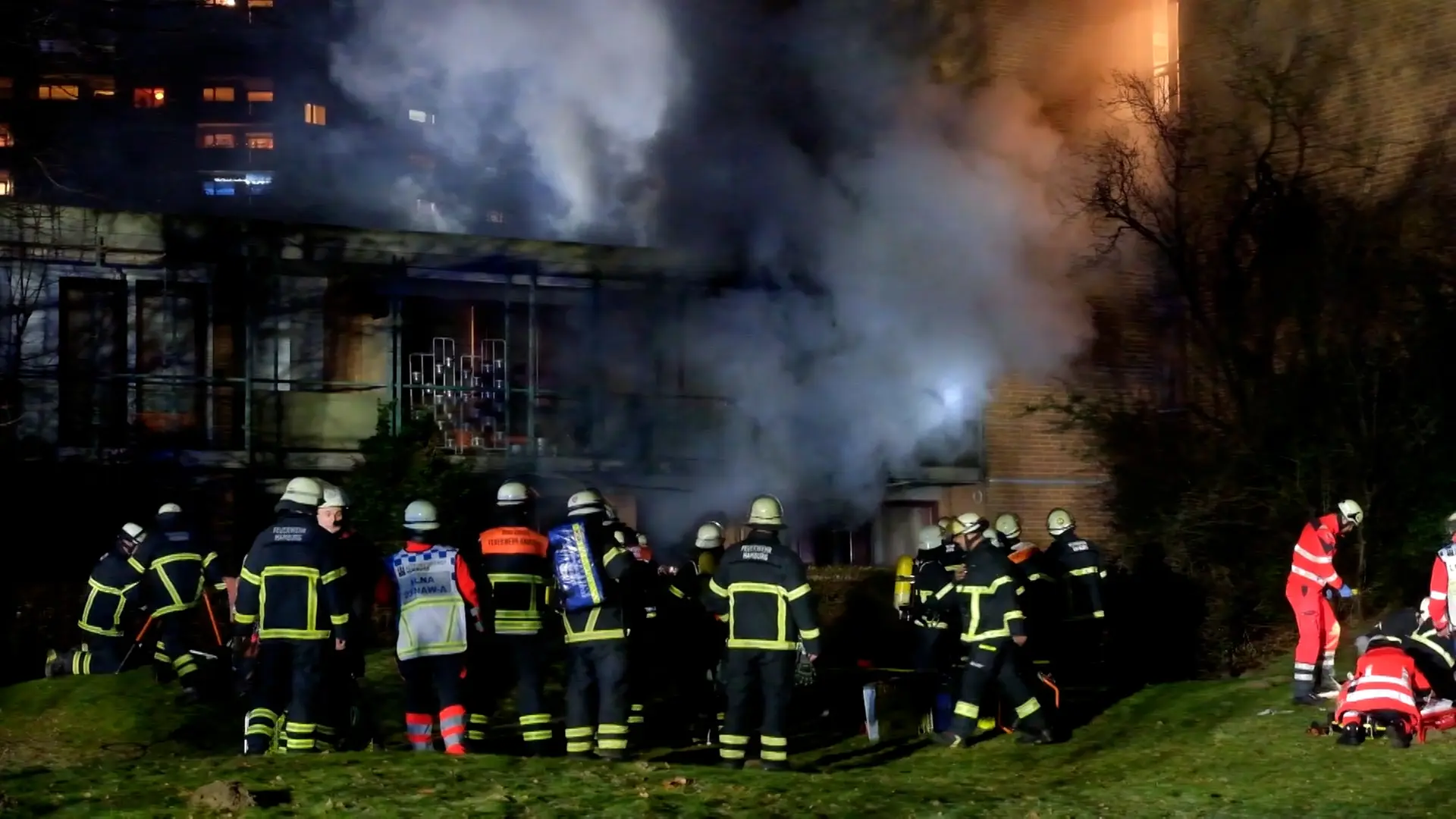 Parallel dazu wurde der Brand durch einen Trupp unter Atemschutz mit einem Strahlrohr bekämpft. Unter schwerem Atemschutz suchten Trupps das Gebäude nach weiteren Personen ab und evakuierte 32 Personen. Eine Person war schwer verletzt, fünf Personen leicht verletzt und 26 Personen blieben unverletzt. Eine Person wurde mit dem Rettungswagen in ein umliegendes Krankenhaus gebracht, alle weiteren konnten vor Ort betreut werden. Ein HVV-Bus diente zur vorübergehenden Sichtung und Betreuung der Betroffenen.