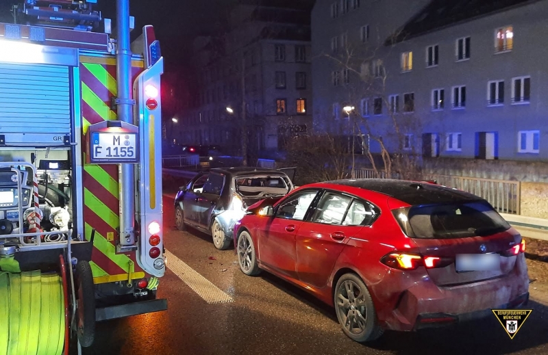 Aus unbekannter Ursache sind drei Pkw an der Anschlussstelle München-Schwabing aufeinander gefahren. Im vordersten Fahrzeug, einem BMW X1, befanden sich eine Frau und ein Mann, die beide unverletzt blieben. Im mittleren Fahrzeug, einem VW Up, wurden eine Frau und ein Mann jeweils leicht verletzt, ein weiterer Mann blieb unverletzt. Im letzten Fahrzeug, einem BMW, blieb die Fahrerin unverletzt. Nachdem die Feuerwehr die Unfallstelle abgesichert hatte, übernahmen die Einsatzkräfte die medizinische Erstversorgung und Betreuung der Beteiligten. Die Verletzten kamen in Münchner Kliniken. Zwei weitere Personen wurden auf eigenen Wunsch zur Abklärung ebenfalls in Krankenhäuser gebracht.