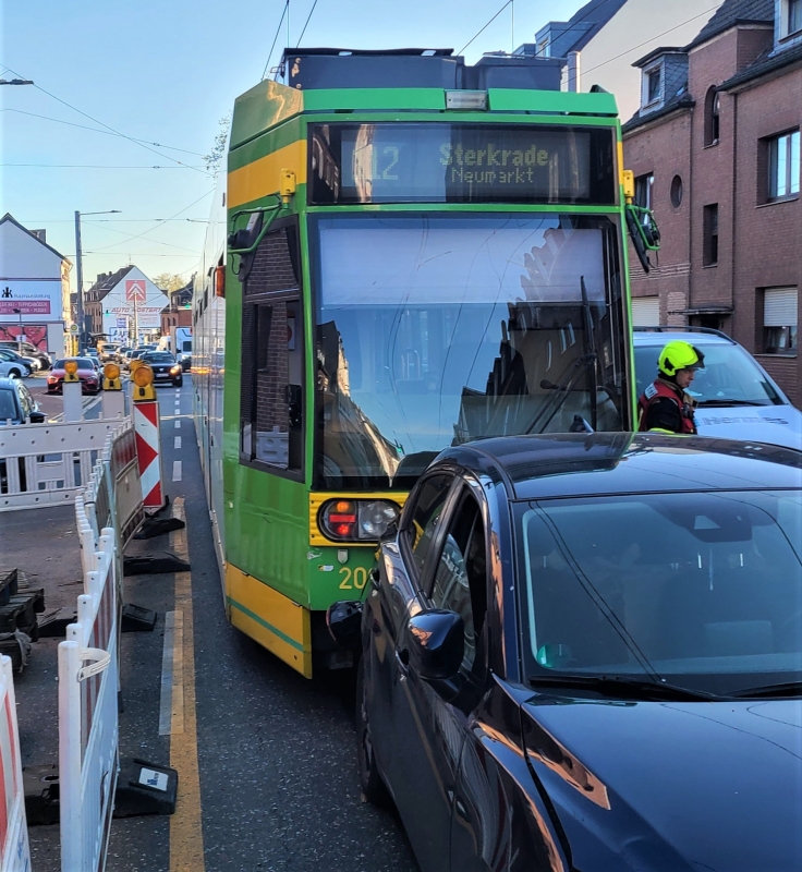 Am gestrigen Donnerstagabend ist es gegen 18:30 Uhr auf der Mülheimer Straße zu einem Verkehrsunfall zwischen einer Straßenbahn und mehreren PKW gekommen. Dabei sind insgesamt drei PKW und eine Straßenbahn durch den Unfallhergang beschädigt worden. Ein Mitglied der Freiwilligen Feuerwehr Oberhausen war zufällig als Ersthelfer vor Ort und konnte die betroffenen Personen bis zum Eintreffen der Einsatzkräfte von Feuerwehr und Rettungsdienst betreuen.