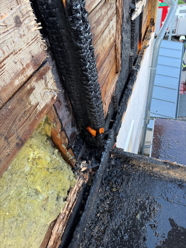 Aus bislang unbekannten Gründen hatte sich am Mittabend, 22. April unter dem Giebel an der Fassade des Bürogebäudes einer Schreinerei in Oberlengenhardt ein Feuer entwickelt. Just zu diesem Zeitpunkt im benachbarten Feuerwehrmagazin anwesende Brandschutzkräfte entdeckten dieses und lösten um 19:05 Uhr Alarm aus. "Das beherzte Eingreifen der Kameraden verhinderte einen Großbrand", konstatierte Einsatzleiter Rainer Zillinger, dass auch keine Personen verletzt wurden. Der Kommandant beschrieb eine unheilvolle Dynamik des aufsteigenden Rauchs, die er selbst auf der Anfahrt zum Einsatzort beobachtete. Da dieser bereits durch die Dachziegel nach außen drang, aktivierte er zusätzlich die Drohnengruppe aus Bieselsberg. Parallel zum Löschangriff, auch über die Drehleiter veranlasste der Einsatzleiter die Trennung des Gebäudes vom Strom sowie die Beseitigung von Elektrogeräten im Gebäudeinneren. "Das Feuer hatte sich den Weg hinter die Verschalung der Fassade gesucht, wo dann verbaute Holzweichfaserplatten mit dem Löschwasser reagierten und ein Ausbreiten der Flammen verhindert wurde", fasste Zillinger das Eindämmen des Brandes zusammen. Durch den Einsatz der Drohne konnte die Feuerwehr zudem auf das Abdecken des Daches verzichten, da die Bilder keinen Gefahrenbereich mit erhöhten Temperaturen oder Flammenbewegung aufwiesen. Davon überzeugten sich vor Ort am Bildschirm der Übertragung unter anderem Kreisbrandmeister Bernd Meyer und sein Stellvertreter Tido Lüdtke sowie Schömbergs Bürgermeister Dr. Matthias Stepan. Das umsichtige Vorgehen der Brandschutzkräfte begrenzte den Sachschaden auf rund 20.000 Euro, zumal im Gebäudeinneren kein Wasserschaden festzustellen war. Nach rund zwei Stunden konnte der Einsatz beendet werden, wenngleich die Feuerwehrabteilung Oberlengenhardt noch Brandwache hielt. Die Feuerwehr war mit 50 Brandschutzkräften und sieben Fahrzeugen im Einsatz, der DRK Ortsverein Schömberg-Liebenzell mit zwei Fahrzeugen und fünf Kräften sowie die Polizei mit vier Beamten und zwei Fahrzeugen. Für die Dauer des Einsatzes blieb die Ortsdurchfahrt Oberlengenhardt gesperrt.
