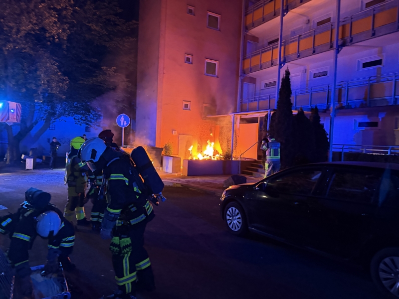 Vor Ort brannten mehrere fahrbare Großmülltonnen. Der Brand drohte zu diesem Zeitpunkt bereits auf das Vordach und den Eingangsbereich des Gebäudes überzugreifen.