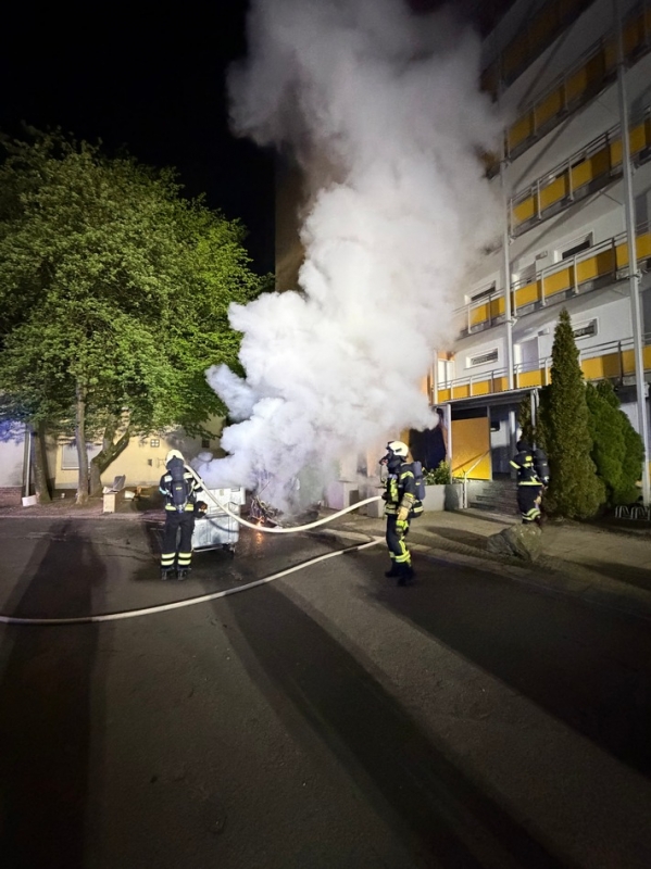 Durch den Angriffstrupp wurde eine Angriffsleitung aufgebaut, während ein weiterer Trupp die Tonnen vom Gebäude wegzog.