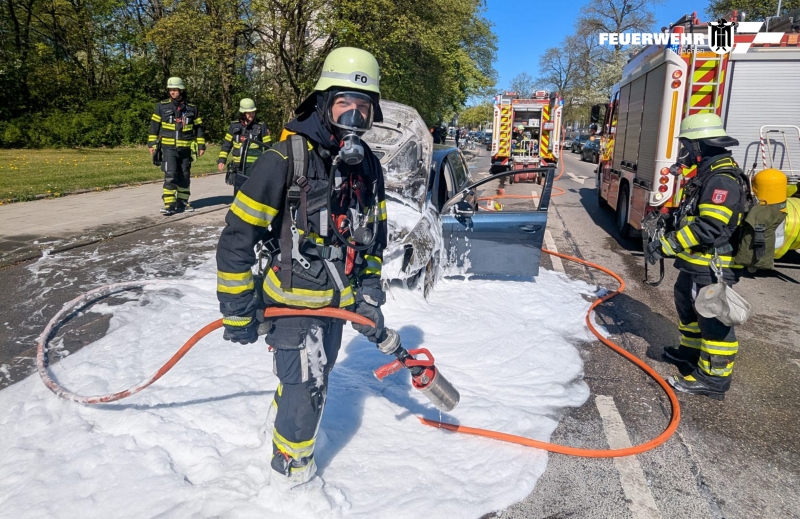 Einsatzkräfte der Feuerwehr München wurden gegen 10.20 Uhr in die Neurieder Straße alarmiert. Am Einsatzort stand ein VW Golf in Flammen. Passanten hatten noch versucht, den Entstehungsbrand zu löschen. Ein Atemschutztrupp bekam die Flammen mit Löschschaum rasch unter Kontrolle. Anschließend wurde der Pkw mit einer Wärmebildkamera auf Glutnester kontrolliert.