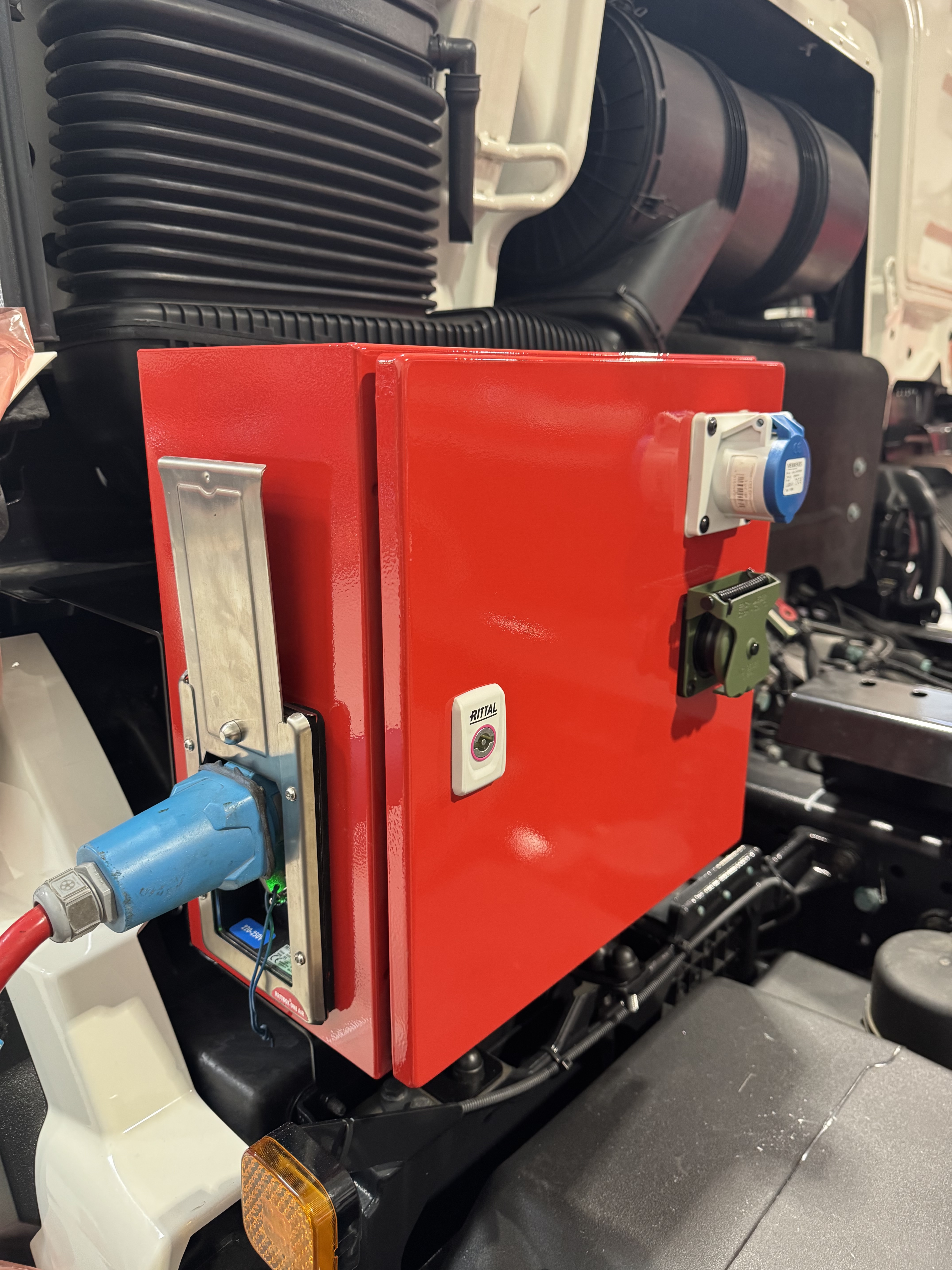 Schaltschrank IP 66 hinter dem Fahrerhaus zur Aufnahme der 230V-Technik und Steckdosen