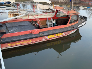 Im Auftrag der DLRG Kreisgruppe Wiesbaden-Biebrich-Amöneburg wird hier ein ehem. Hilfsfeuerlöschboot angeboten. Mit dem um 360° drehbaren Antrieb ist das Boot sehr einfach zu steuern und kann auf der Stelle gedreht werden. Durch eine eingebaute Feuerlöschpumpe (Vorbaupumpe an Nebenantrieb, mit 1xB und 1xC Abgang, Seerohransaugung) kann das Wasser (800 l/m) direkt angesaugt und mit 8 Bar Druck über Verteiler und Schläuche gepumpt werden. technische Daten: