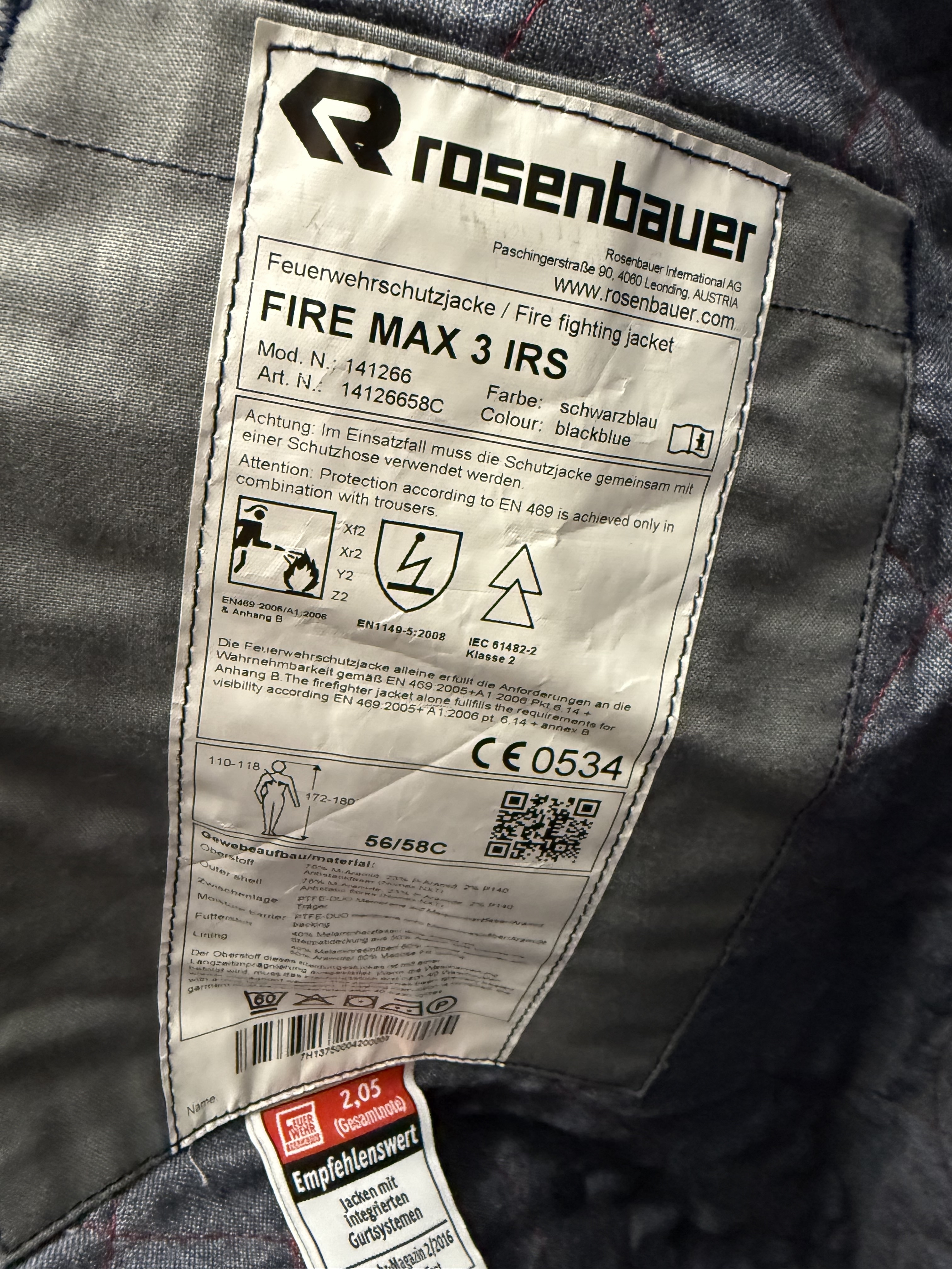 | Biete: Abverkauf: ROSENBAUER Feuerwehreinsatzjacke FIRE MAX 3 IRS (ohne Gurt), Nomex NXT, schwarzblau | |||
