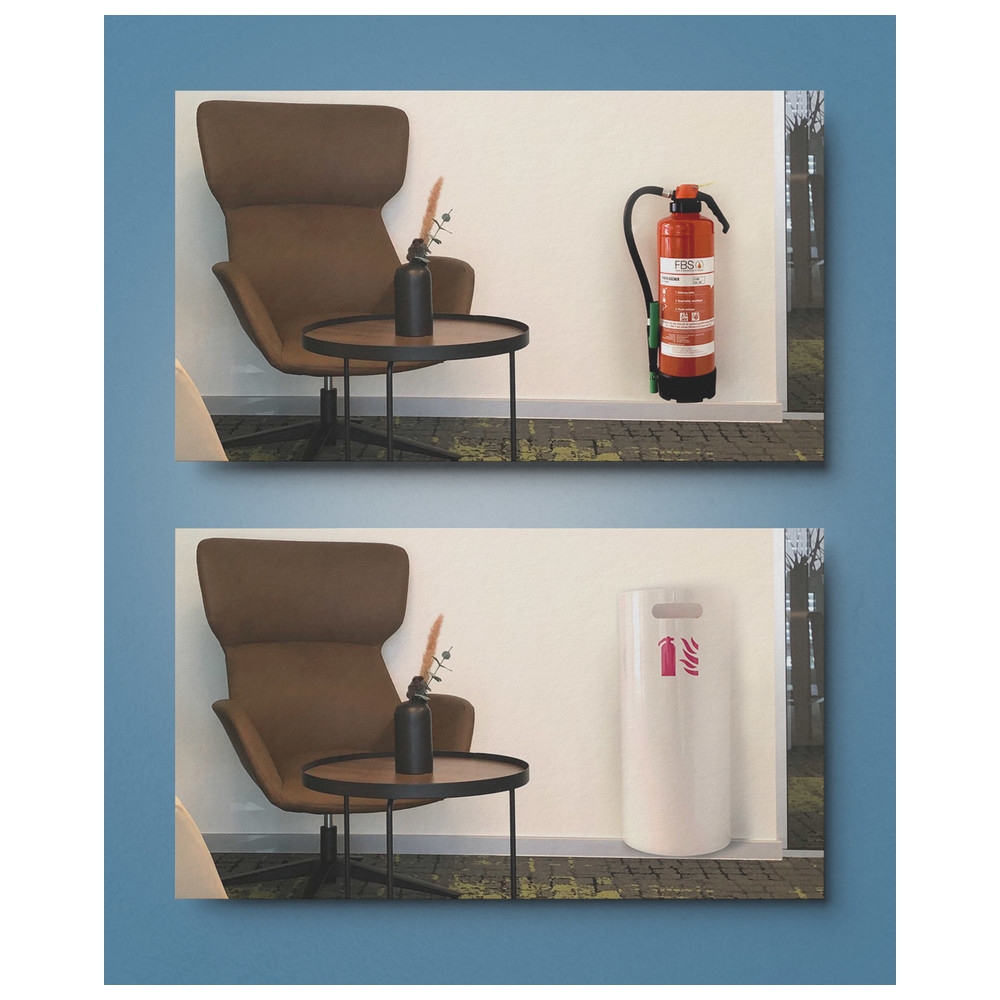 Diese Frage ergibt sich in gewerblichem Rahmen, wie auch im privaten Raum. Die Dönges Design Abdeckung für Feuerlöscher besticht durch ihr schlichtes Understatement: "weniger ist mehr". Das pulverbeschichtete Stahlblech ist aus einem Stück geformt und geschmackvoll in die richtige Form gebogen. Das Design ist klar und in edlem Weiß gehalten.