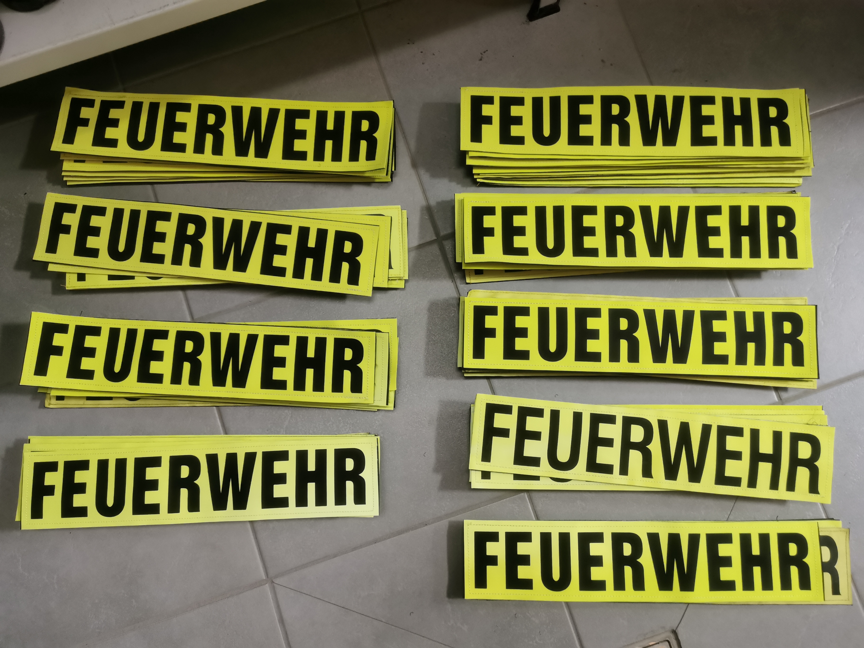 Wir verkaufen 85 Klett-Rückenschilder "FEUERWEHR" für Feuerwehrjacken etc.